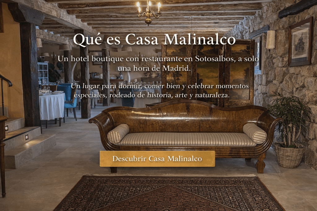 En Sotosalbos, junto a su iglesia románica y a solo una hora de Madrid, Casa Malinalco es más que un hotel y un restaurante. Es un lugar para viajar sin ir lejos, para celebrar lo importante y para quedarse cuando el tiempo invita a ir más despacio. Aquí se encuentran la cocina de nuestra tierra, el descanso, el arte y los momentos que, sin darte cuenta, se vuelven memoria.